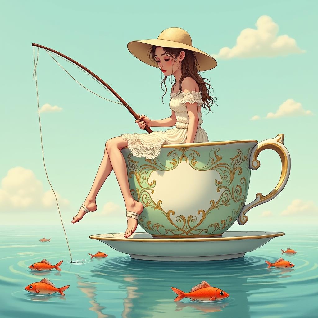 I wrote this image prompt: “create an image of a cute cartoon lady is sitting on a cup of a tea and fishing”